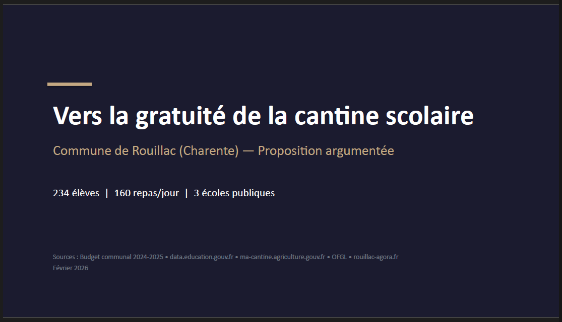 Je propose la gratuité de la cantine scolaire pour nos 3 écoles, soit 343 élèves, répartis dans 11 classes. Avec les aides prévues par l'état, le montant s'élèverait à 35000 euros (par an soit moins de 1 euros par mois par personne pour nourrir 234 enfants nourris par la commune dans le cadre scolaire. Cela ferait passer le budget global de ce poste actuellement de ~3% à ~4% du budget total.